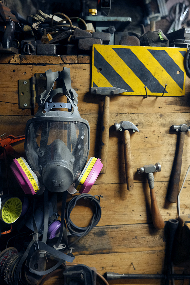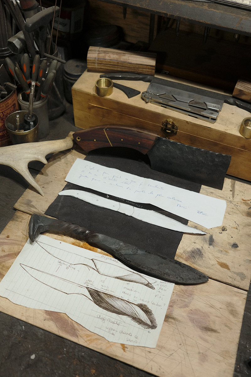 Car au-delà de la technique, il y a un rapport intime au travail manuel. «Je suis centré sur ce que je fais, dans un état méditatif. Je travaille beaucoup avec les éléments : cuir, acier, bois, feu. Dans l’acier, tu peux y mettre ton âme», dit-il. Ce lien profond, il le partage aussi.